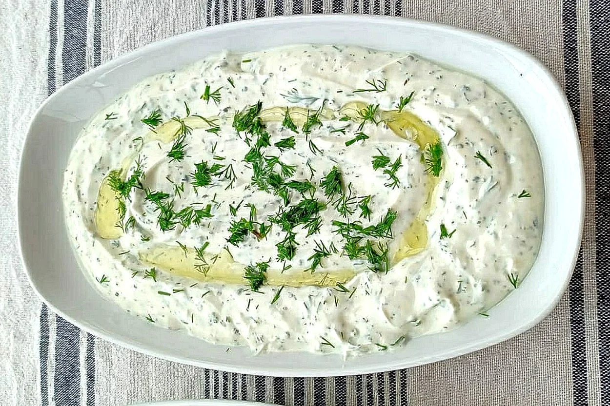 Süzme yoğurt (süt ürünü), sarımsak, tuz, dereotu, baharat karışımı.